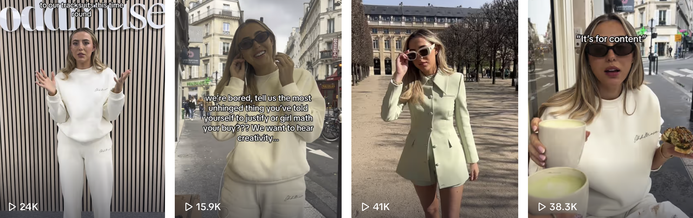 Odd Muse bruger TikTok som en fortællingsplatform – ikke bare til trends, men til at forklare deres brand, produktion, og mission. Ofte forklaret af funderen selv - som også er enormt aktiv på hendes egen platform.